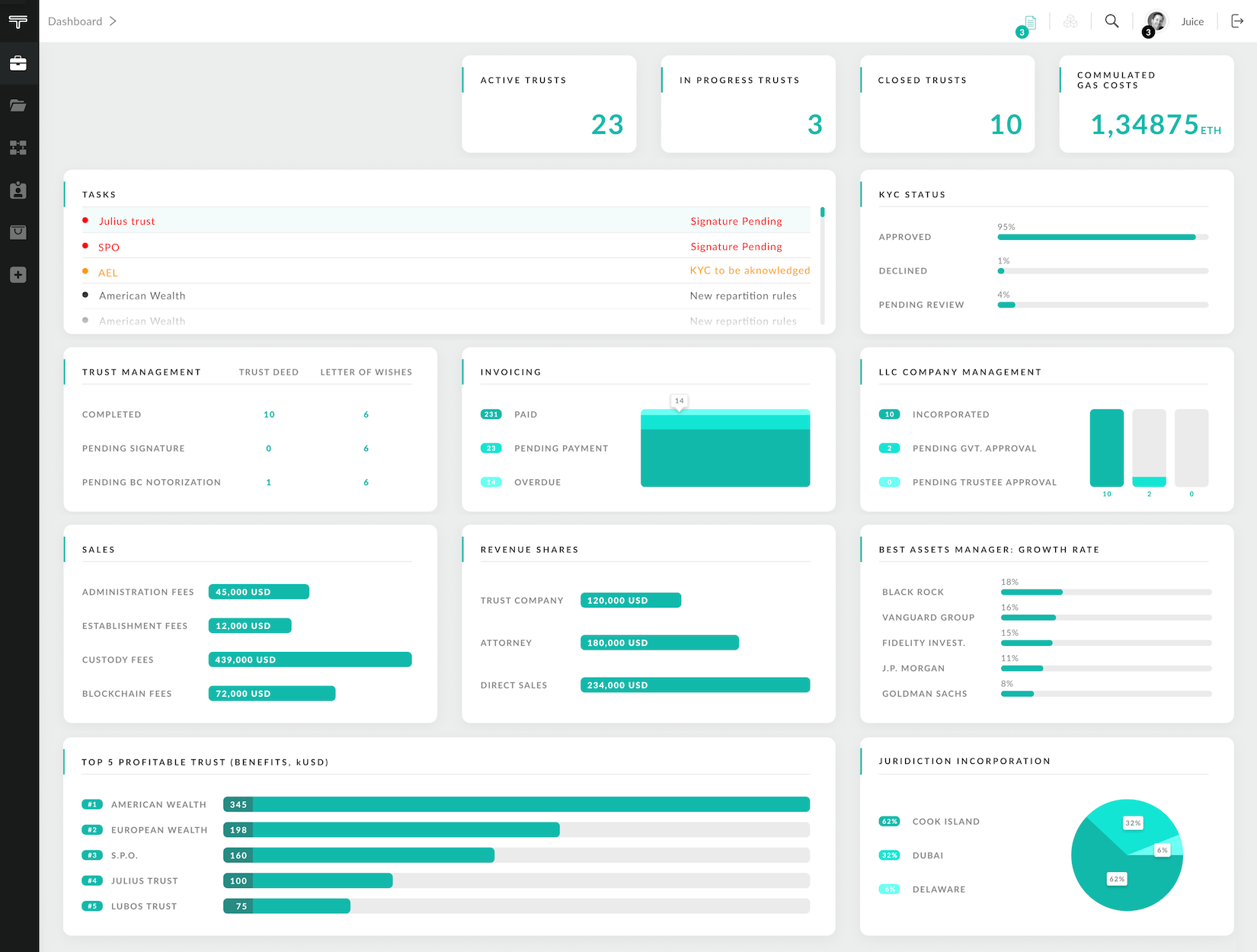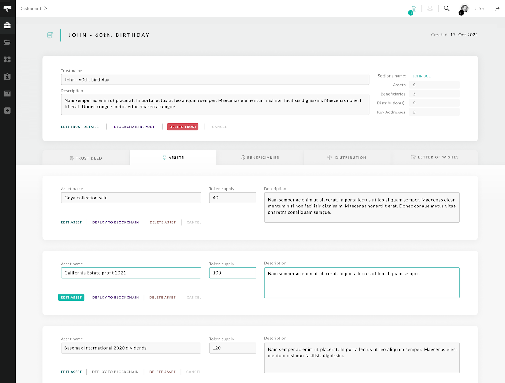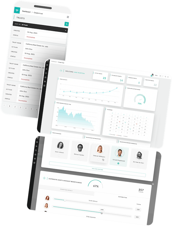 Adding digital technology as well as blockchain functionality to the current traditional way of creating and managing Trusts insures safe and effortless way to create and manage Trust deeds and Letter of wishes, with and extra layer of security features such as smart contract notarizations in blockchain, multi signature, tokenization and much more.