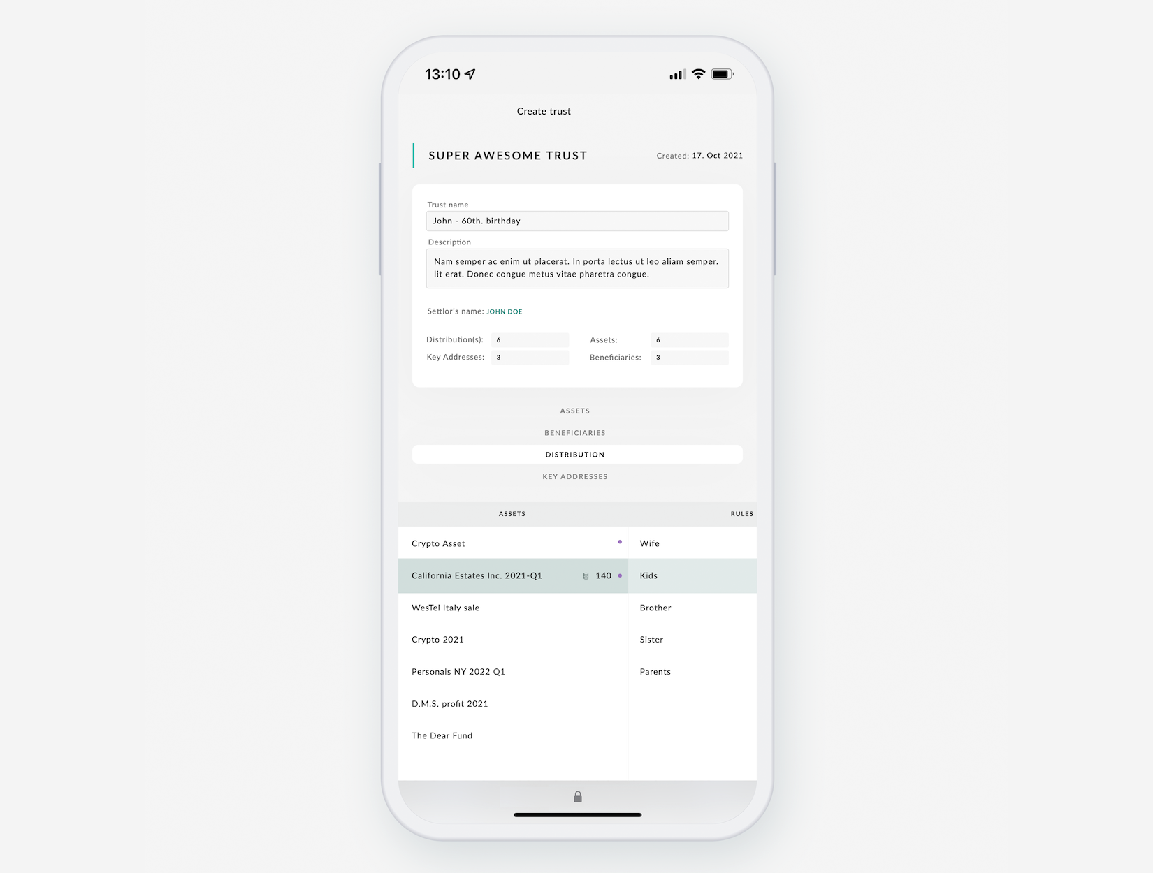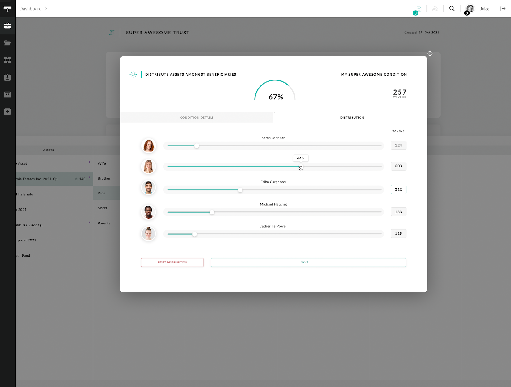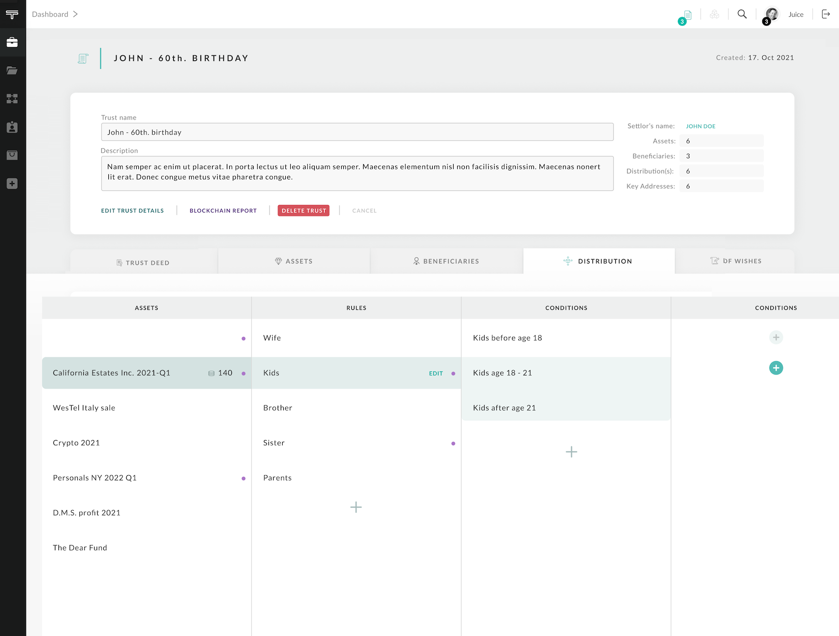 Once the rules and conditions for the Trust asset distribution are met, an oracle call to blockchain ismade which initiates the asset distribution amongst the beneficiaries. Each condition can have multiple sub condition levels.