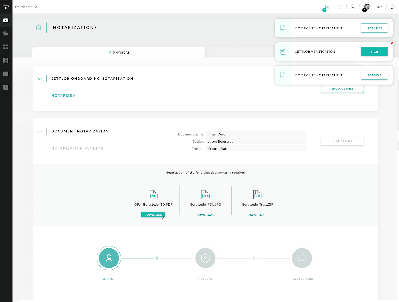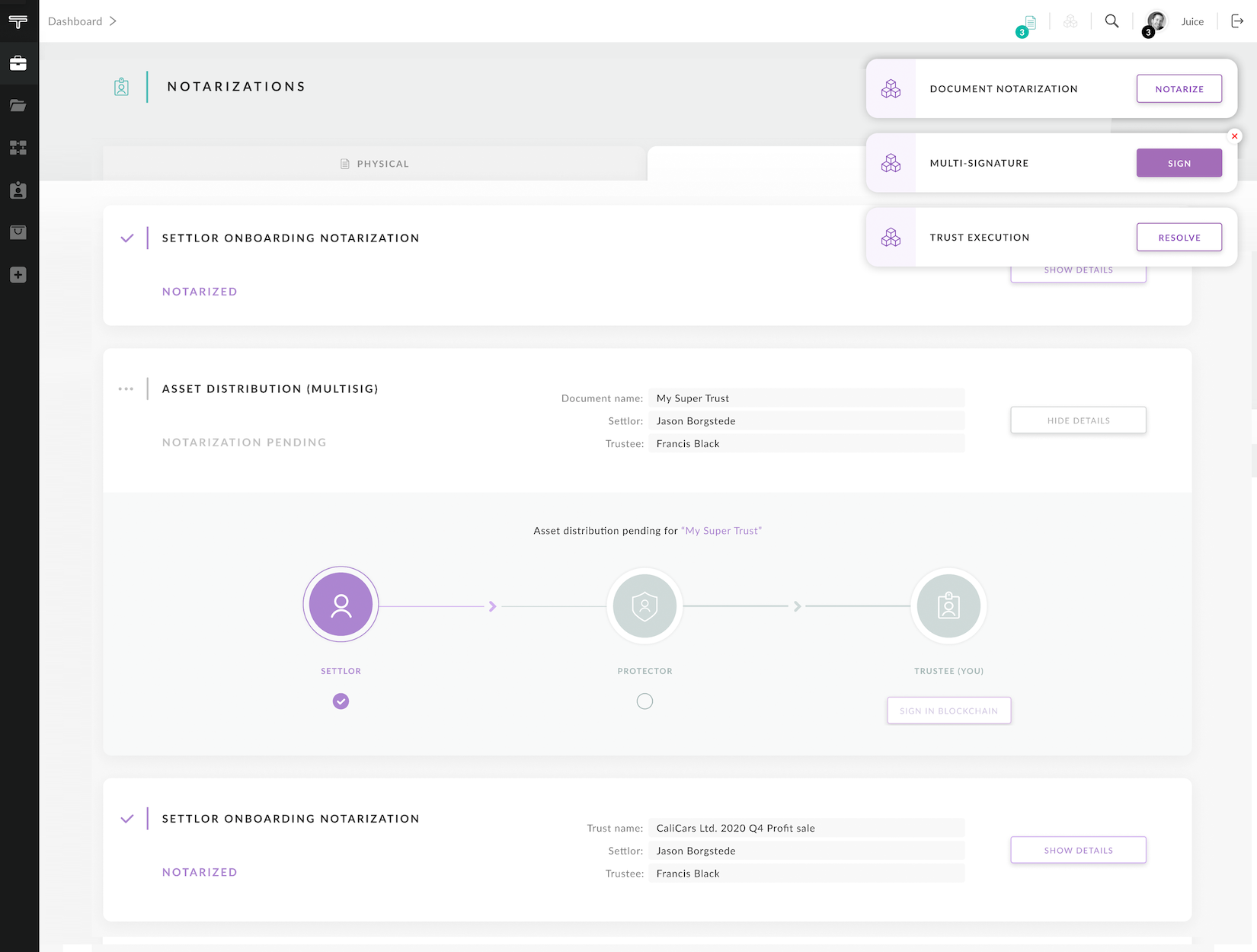 Allows onboarding of users by using their Ethereum public keys and assigning them as various roles which determines their rights in Trust management process (trustee, settlor, protector).